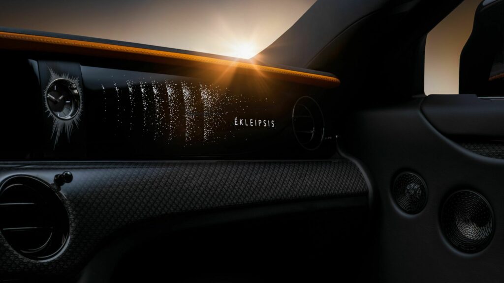 Adding a touch of luxury is the analog timepiece, featuring a sparkling 0.5-carat diamond set within the bespoke bezel. Further exploring the interior reveals the Starlight Headliner in an animated display. It mirrors the effect of a solar eclipse, unfolding every time the car ignites and the doors close, a sight to behold for exactly 7 minutes and 31 seconds, the maximum duration of a total solar eclipse.