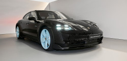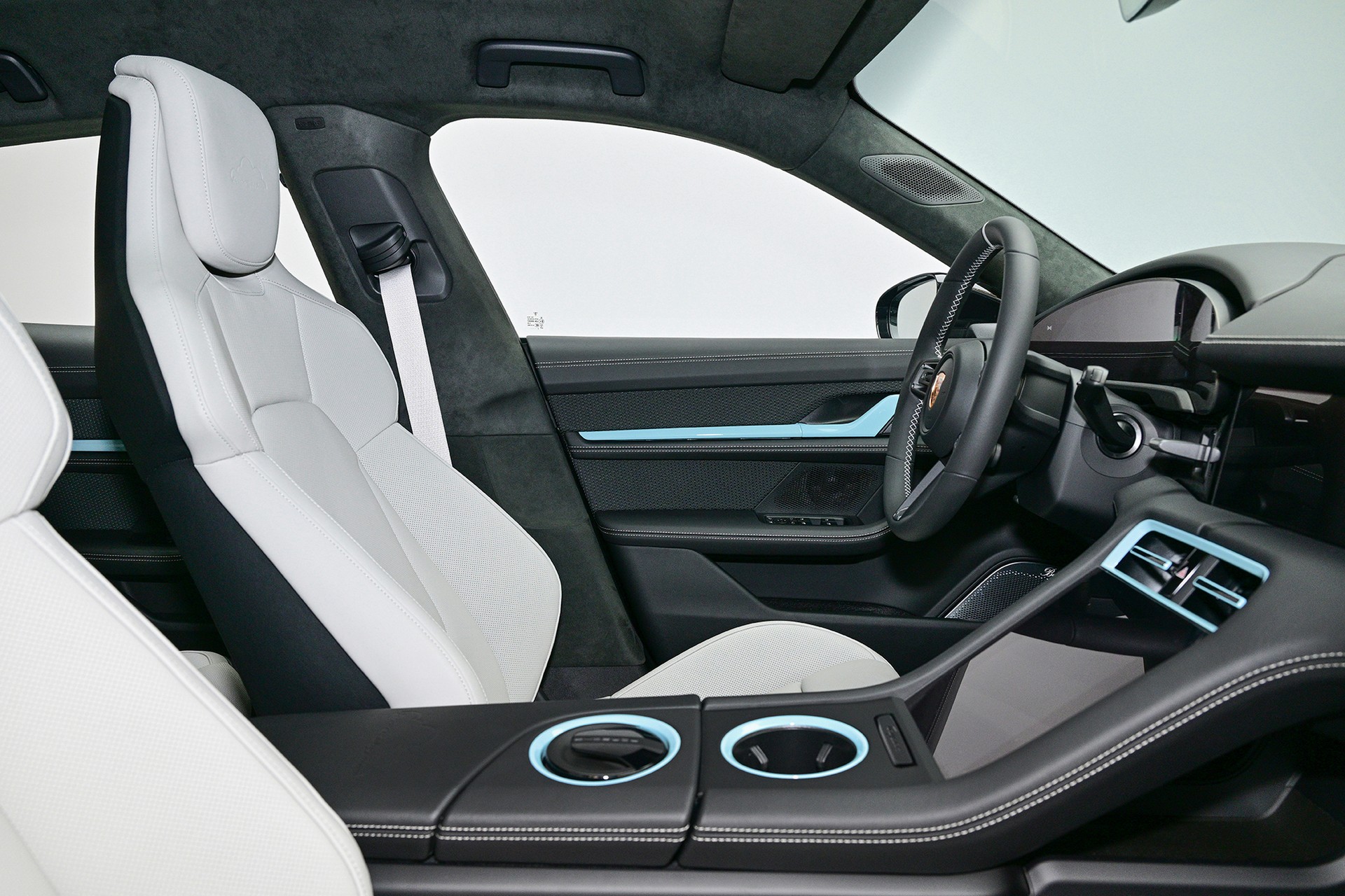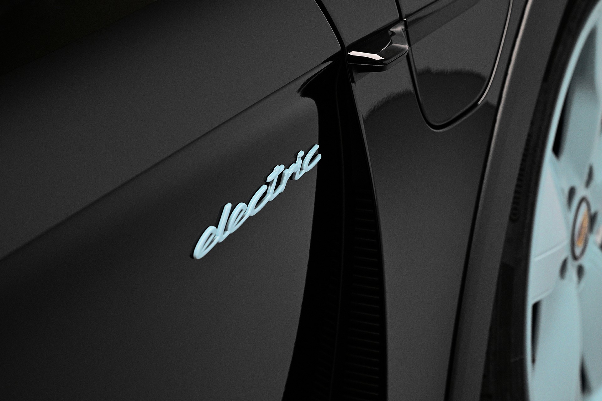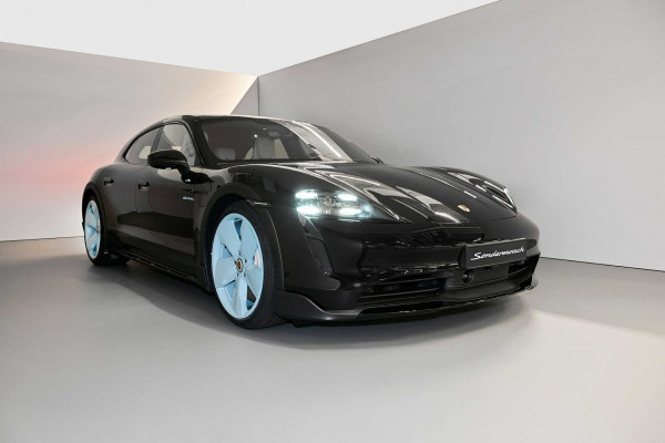 The body is painted a sleek glossy black, but the 21-inch Exclusive Design wheels in a color named Meissenblue really make the vehicle shine. The light blue hue is likewise used for the Taycan's Electric writing on the driver's door, the rear badge, and the bespoke cloud emblems on the B-pillars.