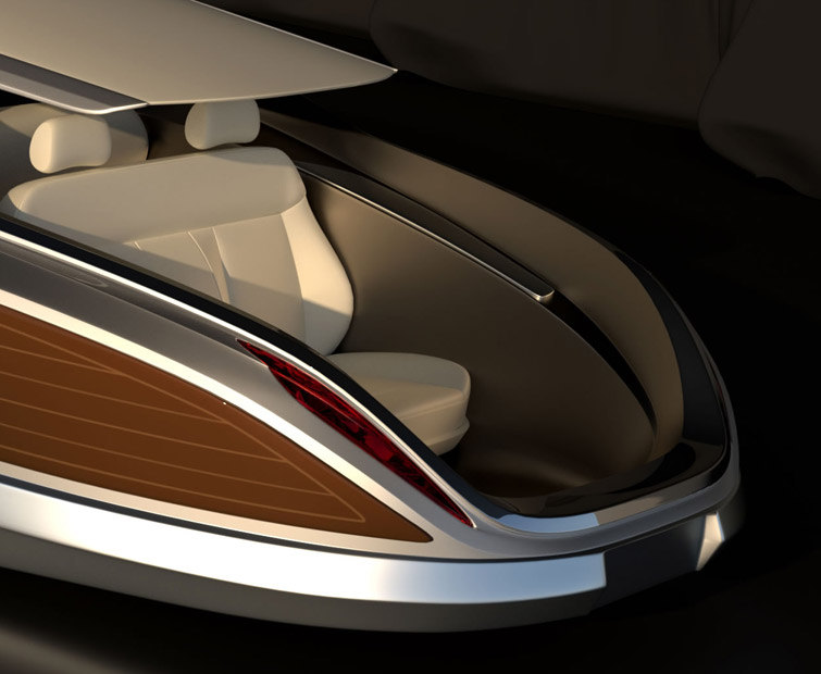 The design of the concept is very stylish, with hubcaps in chrome, wooden details, and a canvas roof. It kind of reminds you of the '50s decade in car design.