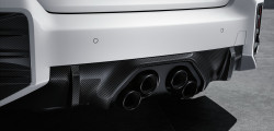 In addition to the carbon fiber rear diffuser, a roof-edge spoiler with a high-gloss black finish is also offered. Additional optional external modifications consist of an M Performance tow strap and an M Performance antenna cover.