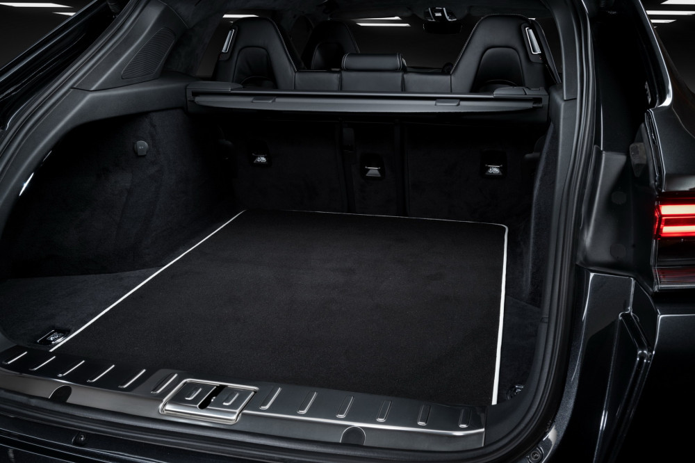 New options of selection of leather and Alcantara; different patterns and colors, contrast stitching and piping, aftermarket floor and trunk mats, and carbon fiber trim. For a final note. The tuner embossed its logo on the door trim, seats, and floor mats.