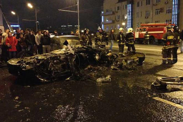 This 18-year-old boy was racing his Ferrari through the streets of Moscow at speeds of over 125 mph. Then he lost control of the vehicle and crashed into the other 2 cars. After the crash, the Ferrari exploded in flames and burned to scorches. Fortunately, no one was seriously injured.