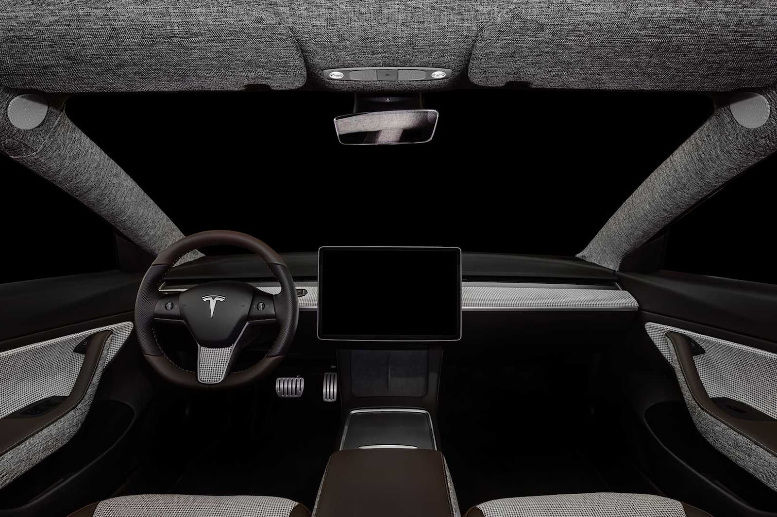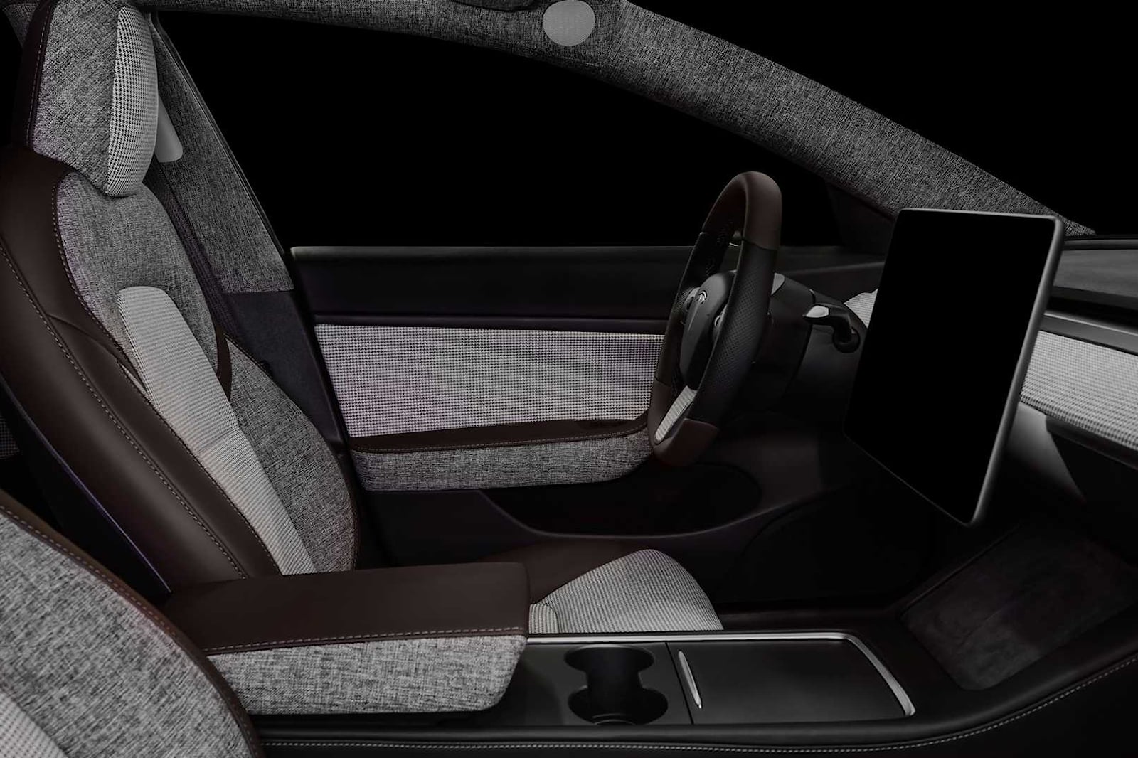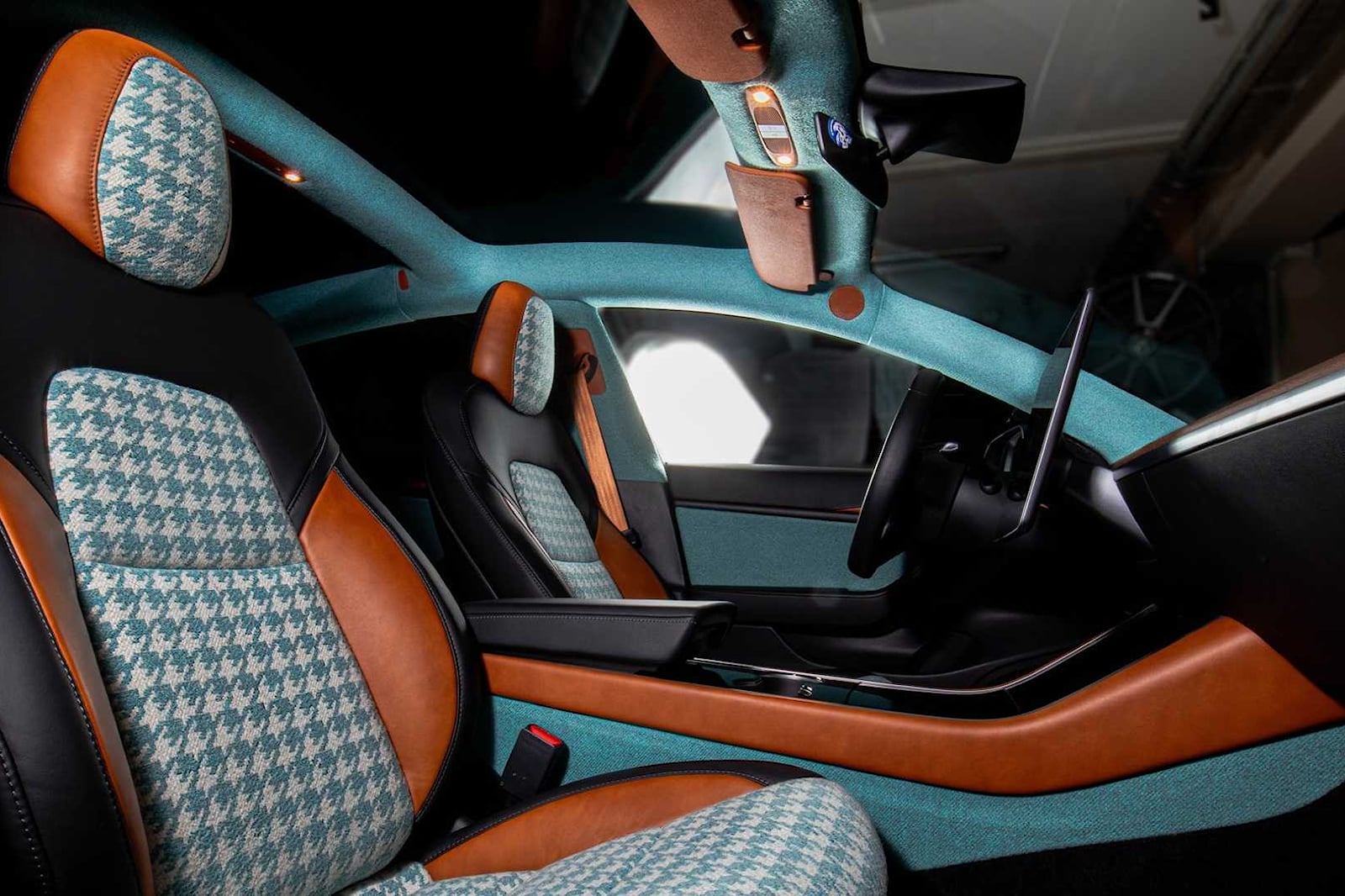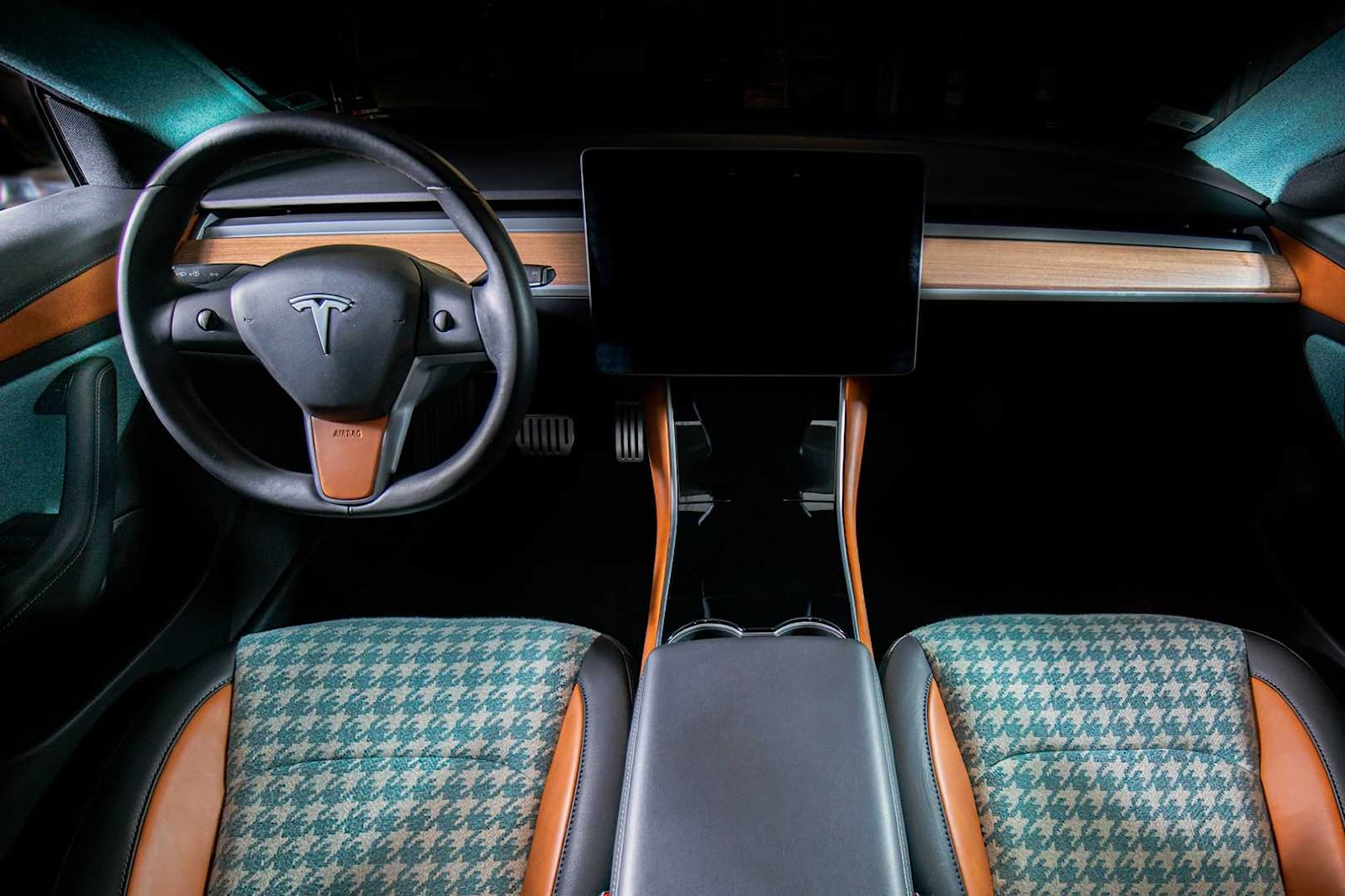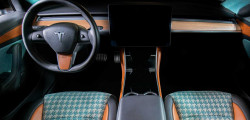 Tesla Model 3 inside has been reupholstered with a grey patterned tartan fabric with matching dark grey fabric that covers elements of the seats, dash, door panels, headliner, armrest, and bottom half of the steering wheel. The seats and door trims, as well as the armrest and steering wheel, are all covered in brown leather.
