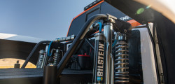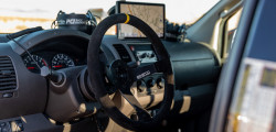 The Nissan Frontier was then sent to Eimer Engineering, where Yoshihara and his Formula Drift crew chief collaborated to design a race-ready suspension system. Meanwhile, WELD Racing Cinch Beadlock wheels are fitted with Yokohama Geolander M/T tires; front Nissan Titan calipers, DBA rotors, and Power Stop pads are used for braking.