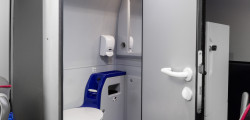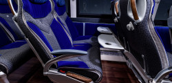 The Tourrider's operators can choose from a variety of fabrics, hues, decorative items, topstitching, piping, or other seating options that are both elegant and easy to maintain. Travelers will also have access to two USB or 110V outlets located in the center of each double seat.