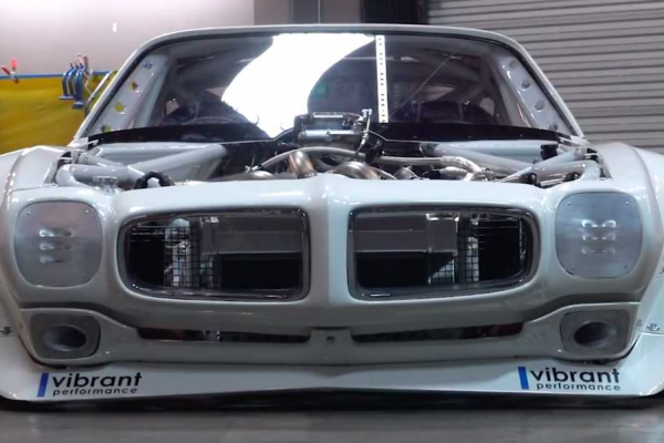 It's a 400 cubic-inch naturally aspirated LSX V8 developed by Motor Machine in California. It boasts several internal upgrades that allow it to produce 700-hp at the wheels and a redline of 10,000 rpm. Because the engine was mounted so far back in the chassis, Stair didn't have enough space to run an exhaust system through the Trans-Am, so he had to cram everything into the engine compartment, which resulted in some stunning effects.