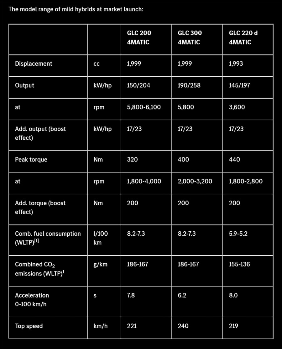 The motor in the GLC 200 4Matic produces 201 horsepower and 236 pound-feet of torque. The GLC 220 d 4MATIC has 194 horsepower and 325 pound-feet of torque. Nevertheless, the GLC 300 has 255 horsepower and 290 pound-feet of torque. Add the boost as well.