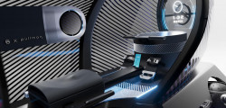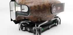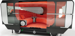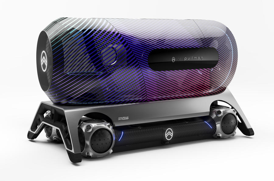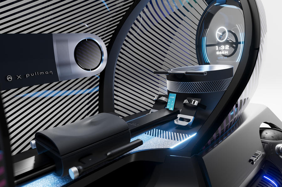 Accor's Sofitel hotel chain inspired the sleek wooden areas, dedicated luggage compartment, bar, soft lighting, and touchscreen. A mobile gym with a rowing machine, a bike, and a holographic digital coach, the Pullman Power Fitness pod.