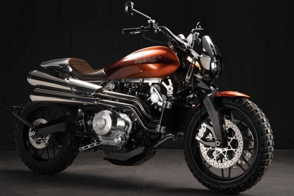 Brough's latest scrambler is named after the Nefud desert in Saudi Arabia, continuing the T.E. Lawrence theme. The rust-red paintwork even looks like Nefud's red sand. The Nefud differs from the Lawrence with high-mounted exhaust pipes, a skid plate, a robust headlamp grill, and a fly screen, in addition to the distinctive paint job.