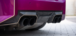 However, the Manhart MH2 GTR III's 705 horsepower and 627 lb-ft make both seem to be three-cylinder city vehicles. Surprisingly, Manhart claims that reprogramming the ECU and adding a carbon intake and performance exhaust were all that were necessary to get those results. Customers wishing to sample this kit for their own M2 have a selection of exhausts to choose from, including four matte black 100 mm (3.9 inch) tailpipes, sports downpipes, HJS cats, and a stainless steel system with valve control.