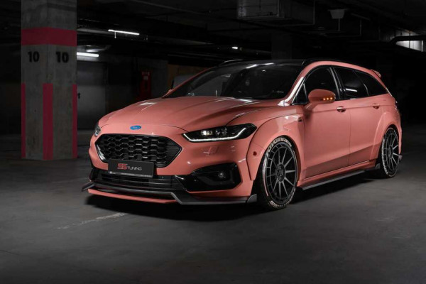 The Ford Mondeo Wagon's strong appearance is courtesy of SS Tuning's bodykit, which features bumper modifications, broad fenders, faux vents, a diffuser, and a rear spoiler. The front bumper, honeycomb grille, and headlights are just a few of the updated Mondeo ST-Line parts that have made their way onto this model.