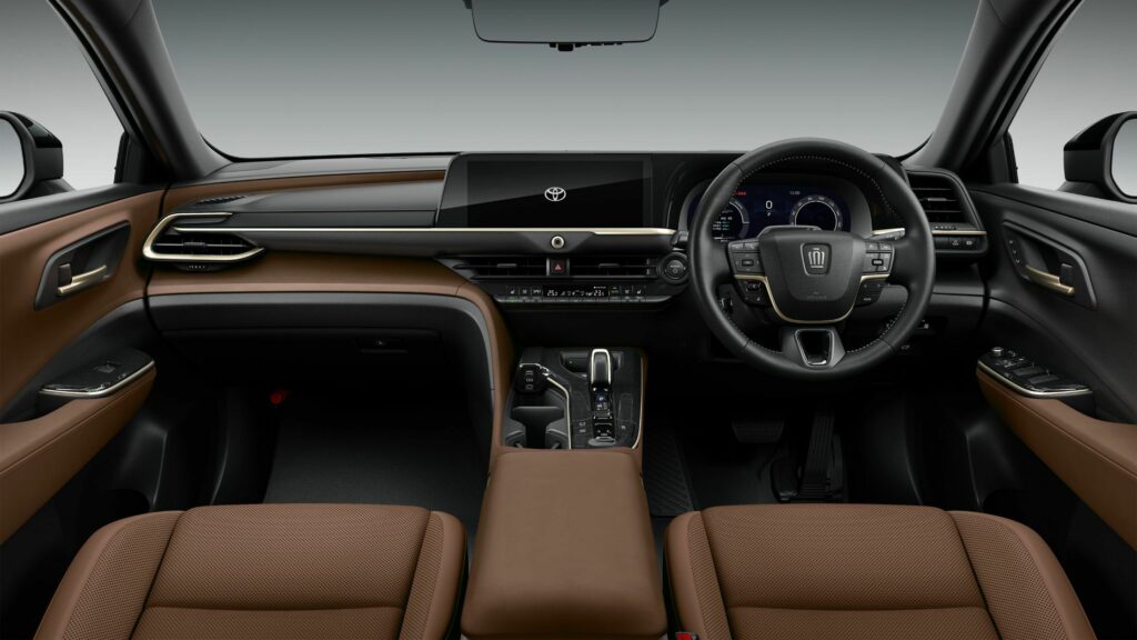Adding to the comfort, the Crown Sport introduces Toyota’s sound-regulating ceiling, effectively maintaining a tranquil cabin ambiance. The powertrain selection presents two options. The first utilizes a self-charging hybrid system, employing the 2.5-liter E-Four Parallel Hybrid System from the Crown Crossover, delivering a combined output of 231 hp to all four wheels through an electric 4WD system.