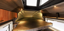 Stepping inside the rear compartment of the BR75 Adventure Camper, one is greeted with a luxurious atmosphere created by the wooden panels, tile-style flooring, and interior lighting. The central feature is a spacious dining area with a foldable table and two benches for seating. The pop-up roof provides additional natural light and allows for standing room inside the camper.