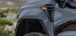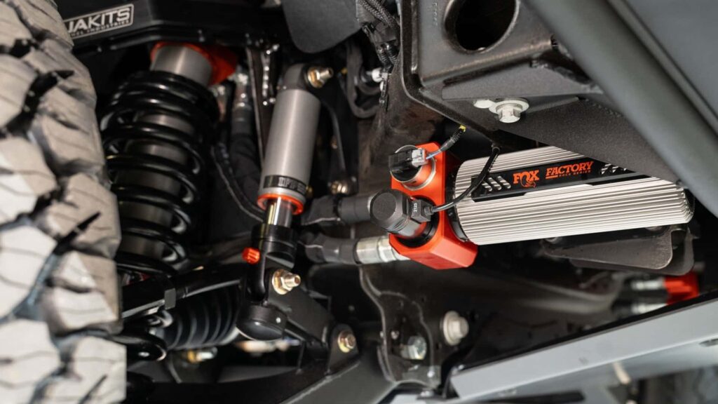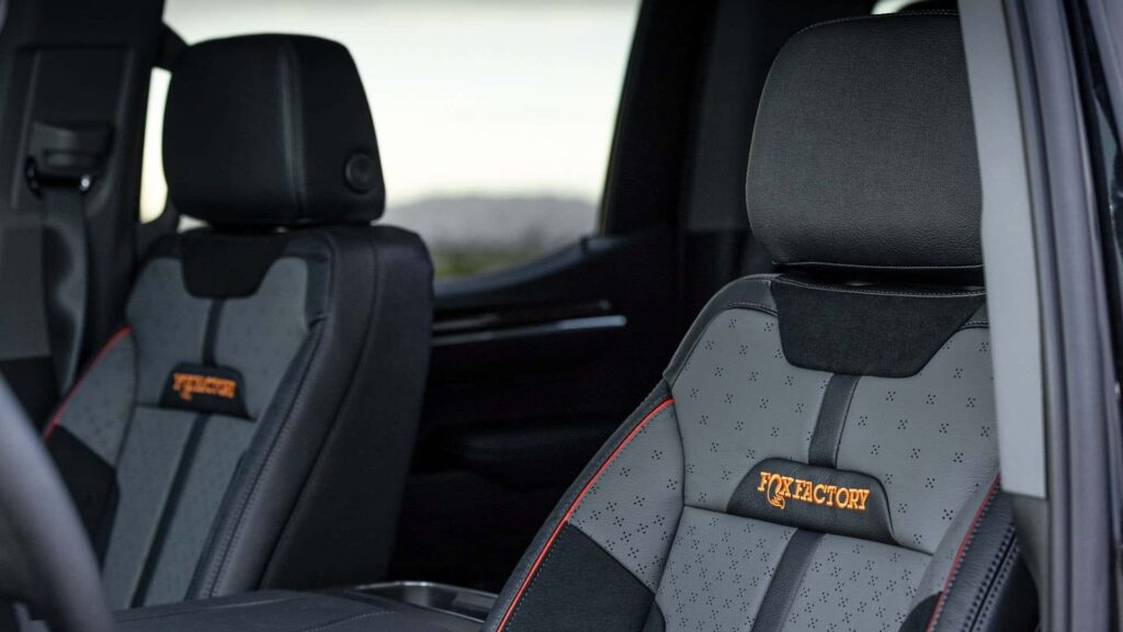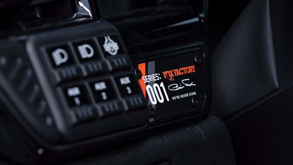 The original 10-speed automatic gearbox remains intact, complemented by a new 2-speed Autotrac transfer case with 2WD, 4HI, and 4LO options. Both the front and rear axles are now Dana 60. BFGoodrich A/T KO2 tires measuring 37 inches and 17×8.5-inch Method wheels are among the further enhancements. A carbon fiber hood, flared fenders, high-clearance bumpers up front and back, and the ability to slot one or two spare tire carriers into the bed are all features that Fox Factory has added.