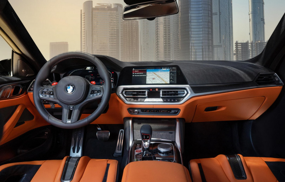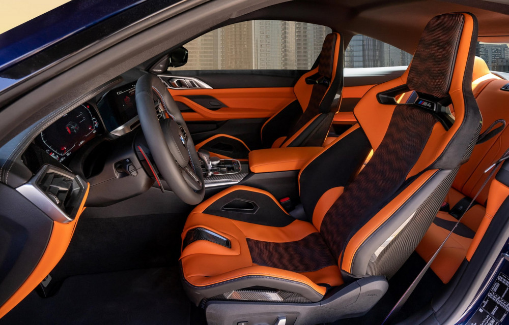 The interior, however, is not as discrete as the exterior, featuring bright Kyalami Orange leather finishing. The seats have the optional upgraded bucket shape, with M-striped seatbelts. There is a special chevron pattern running down the centers.