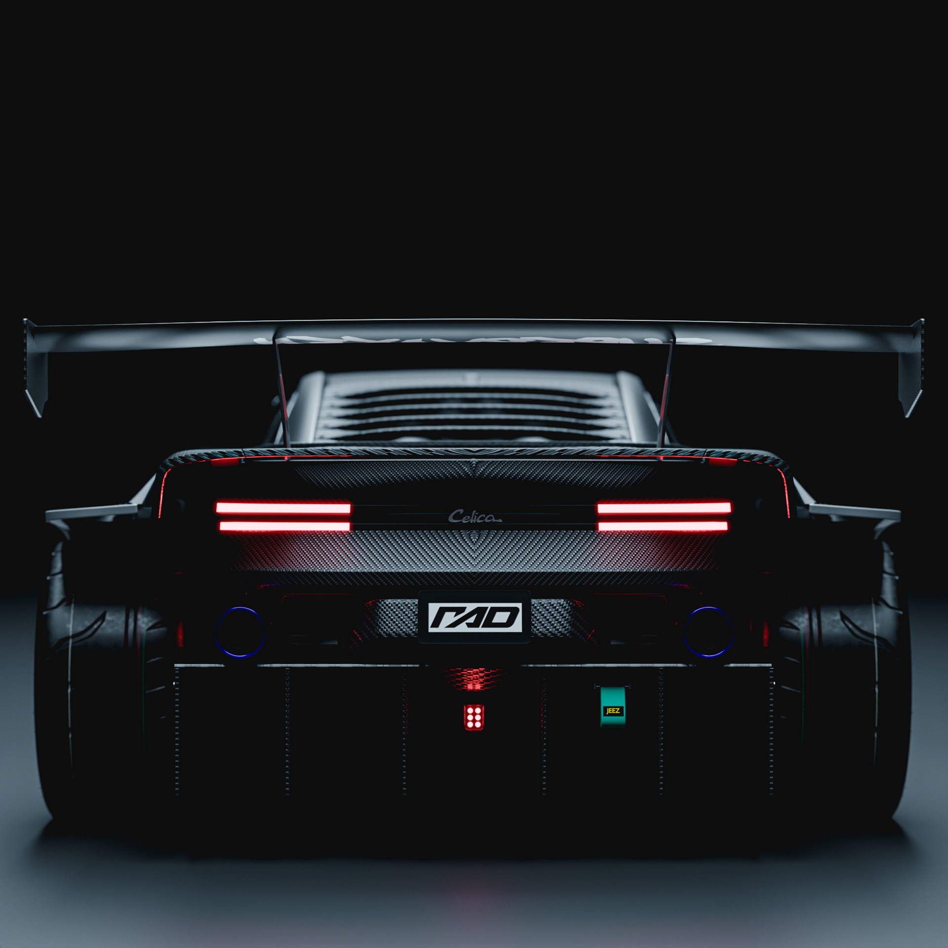 An enormous carbon fiber splitter, elongated side sills, and side-mounted exhaust tips complement the car's already wide track front and rear. Also, the back of the Toyota Celica includes horizontally mounted LED taillights, a permanent rear wing, and a big diffuser.