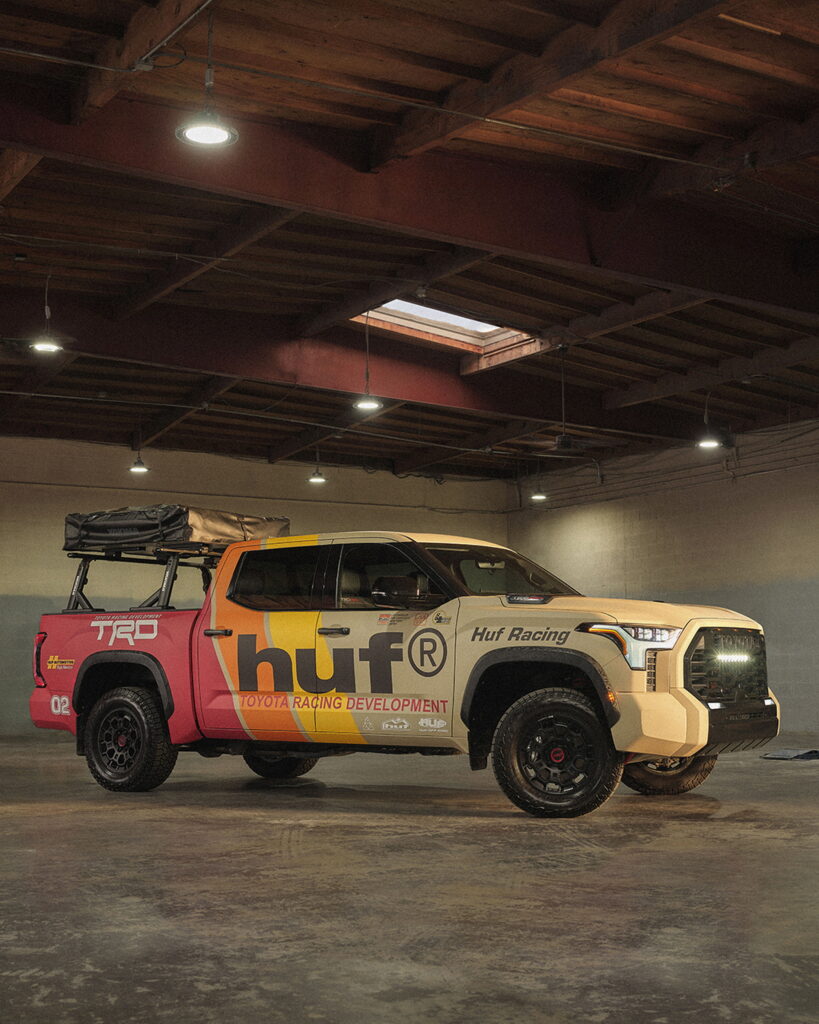 In addition to the clothing and accessories, Toyota and HUF have also teamed up to create a custom vehicle, the 2023 HUF x TRD Pro Tundra, reflecting the off-road influences of this collaboration.