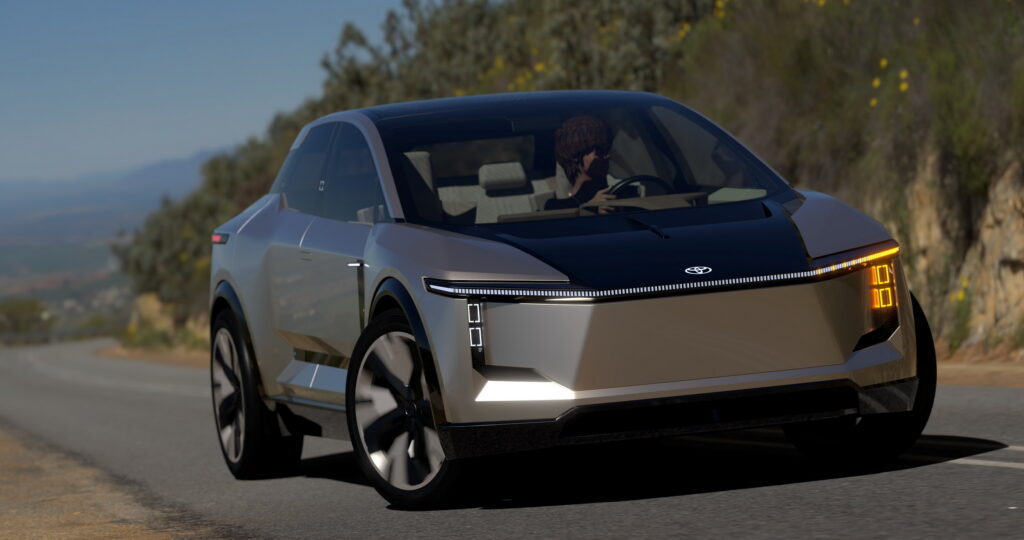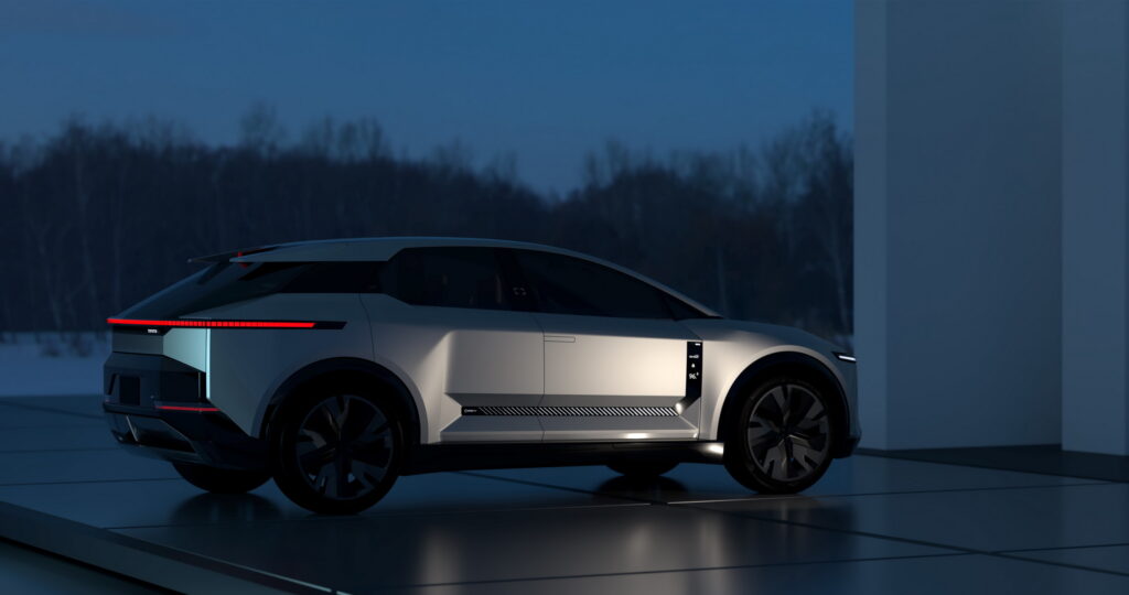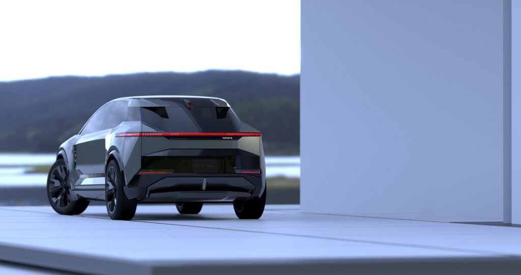 When you look back, you'll notice a futuristic and bZ4X-inspired appearance with a unique rear spoiler, a slim light bar that complements the one up front, contoured bodywork, and flawlessly integrated door handles.