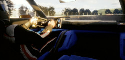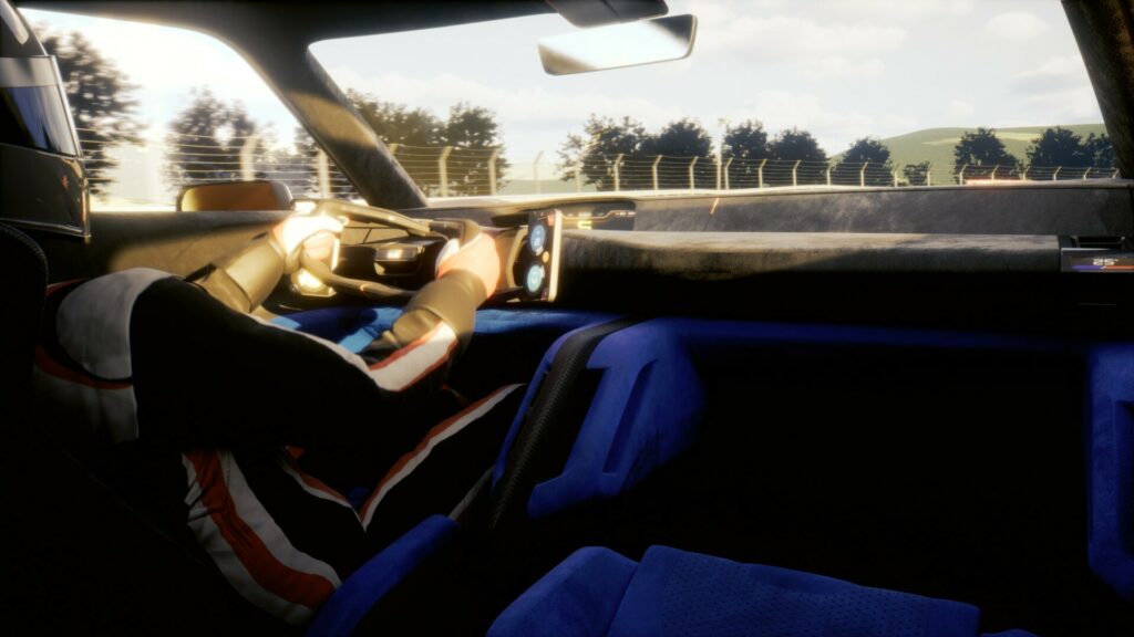 Step inside to find a distinctive yoke steering wheel, a digital instrument cluster, and Recaro bucket seats with carbon fiber backs, all wrapped in a stunning blue Alcantara. The door panels, lower dashboard, and center console all feature exquisite blue weaving.