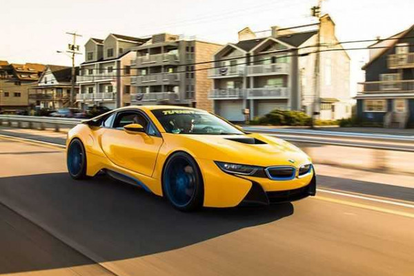 The sports car BMW i8 combines fuel efficiency and looks like a spaceship. Turner Motorsports made it even more futuristic by giving it yellow and blue paint. They also added titanium exhaust system, H&R springs, A-arm camber, and Forgeline AR1 wheels.