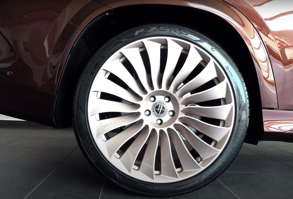 This model has a bespoke two-tone exterior finish individually chosen by the owner, and the Tiffany Rose Gold combined with Amaranto Brown looks lavishing. The styling enhancements for its exterior continue with subtle and elegant chrome HOFELE 23-inch Turbine forged alloy wheels. Here we see a much lighter Tiffany Gold finish.