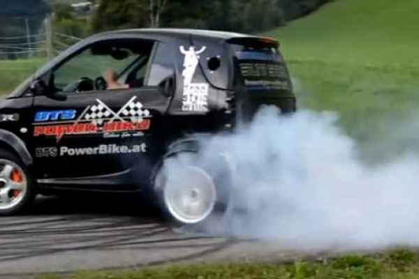 World's most powerful and fastest smart car doing a burnout and donuts. Smart car with Hayabusa turbo engine! brutal exhaust sound!