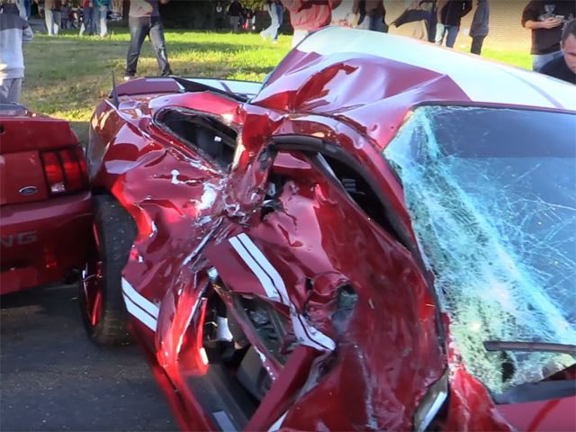 This Shelby Mustang was leaving a car show and the owner hit the gas. Immediately after he lost control and smashed into a parked brand new truck. The inertia took the Shelby further and it smacked another New Age Mustang GT.