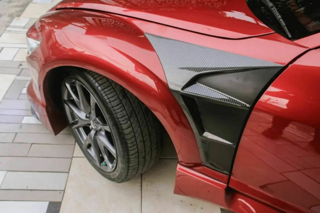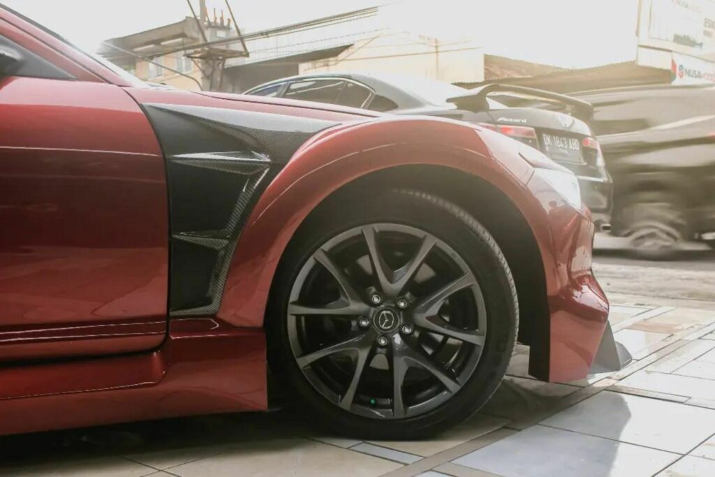 One of the standout features of this build is the LED headlights and taillights sourced from the third-generation Mazda6 sedan. To make these lighting units fit the design, the shop had to redesign the bumpers, fenders, hood, and tailgate. The front bumper appears quite aggressive, with enlarged intakes and a substantial splitter.