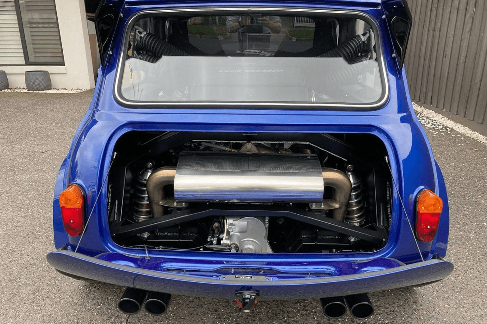 To house the powerful engine, he methodically crafted a unique box frame that cleverly encased the Mini's original chassis. He created a mid-engine setup, resulting in the desired rear-wheel-drive layout, by ingeniously transplanting the front components of a donor automobile.