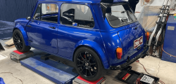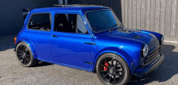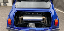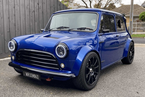 When in motion, the WRX-powered Mini radiates a composed yet lively character, owing to the superb integration of the front and rear suspensions of the Mazda MX-5. Given the Mini's light weight of 2,028 pounds, the EJ25 engine's factory WRX turbo produces an astounding 250 horsepower and 295 lb-ft of torque.