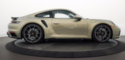 The answer is so simple. Porsche's Exclusive Manufaktur personalization division applied a near-$100,000 paint job to this Turbo. Urban Bamboo is a Chromaflair paint color that varies based on the light and the angle from which it is viewed.