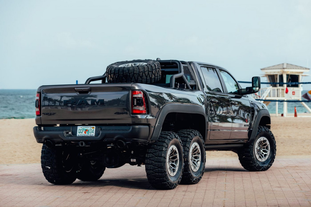 The bed of this 2021 RAM 1500 TRX truck was enlarged to allow for the installation of a third axle and two more wheels by Florida's Apocalypse Manufacturing. These are 18-in wheels with 37-in mud-terrain tires wrapped around them.