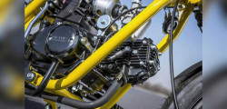 There is only one enormous, fat tube supporting the basic saddle, which has a headlight put upfront and a taillight attached to the back. The engine is held in place by a frame with two cradles.