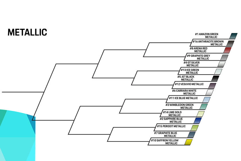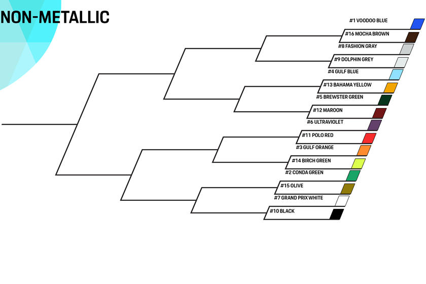 The March Madness brackets tradition was adapted by Porsche and broke into four blocks - classic, metallic, non-metallic, and modern. Meanwhile, each color from the separate bracket has a seed ranging from 0-16, based on its popularity. There's a logical countdown: the first round has the first seed facing off against the 16th seed, while the next in line decrease by one point - the second faces the15th, the third face the 14th, and so on.