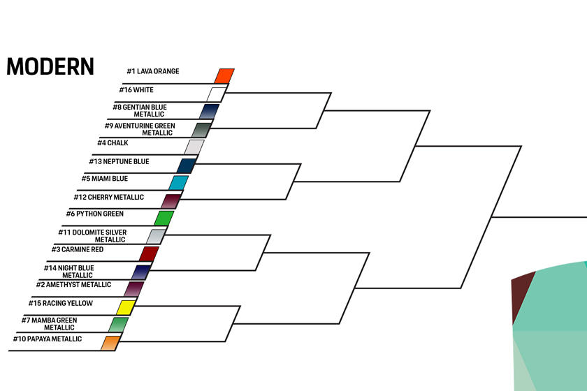 The poll idea was inspired by NCAA Men's Division I Basketball and features a palette of 64 different colors which will compete in 63 different matchups resulting in one winner. So, in the next three weeks, starting today you can access their page. The rules are simple - Porsche will post matchups on Twitter, and any fan can vote the winner until there's only one color remained.