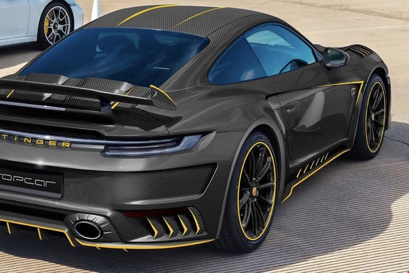 We’ve got carbon fiber on the doors, carbon fiber on the hood, carbon fiber literally everywhere. The rear Porsche inscription has been replaced with a Stinger one, completing the not-so-delicate yellow accent hints.