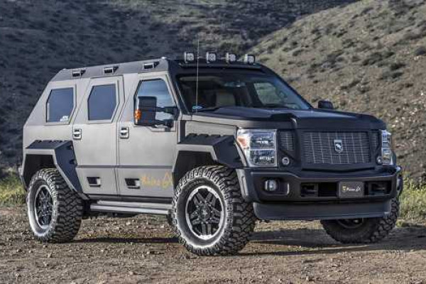 This is a car created especially for bumpy routes, based on Ford Duty F450 Super 4x4, with a steel body.