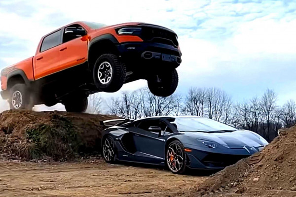 To pull off the maneuver, the YouTuber placed the Lamborghini between two dirt jumps and drove over it. It's interesting to see how effortlessly the TRX lands, which is a credit to its suspension and encourages the YouTuber to repeat the jump believing that the Ram is more than capable.