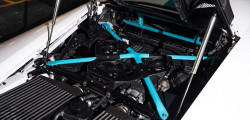 Zyrus tweaked the suspension with Ohlins shock absorbers, fitted unique lightweight wheels with special Pirelli tires, and upgraded the brakes with carbon ceramic discs. Inside, you'll find a black interior with turquoise touches. It still has those cool carbon fiber seats from Lamborghini, but now there's loads of safety gear, like 6-point seat belts, a titanium half-roll cage, and even a fire extinguisher.